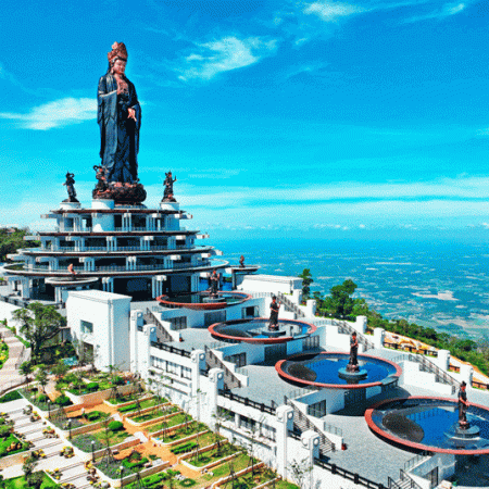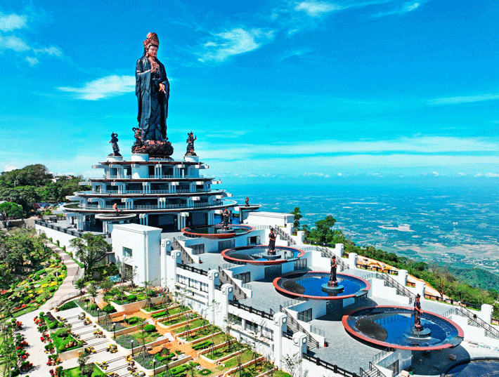 ∙ Được kiến tạo từ 170 tấn đồng đỏ cùng chiều cao 72 mét, Tượng Phật Bà Tây Bổ Đà Sơn trên đỉnh Núi Bà Đen là tượng Phật Bà cao nhất Đông Nam Á. Lấy cảm hứng từ nhiều tượng Phật Quán Thế Âm “quốc bảo” ở miền Bắc, tượng Phật Bà Tây Bổ Đà Sơn có sắc diện từ bi; đầu đội vương miện khắc hình Đức Phật A Di Đà, tay phải nâng bắt quyết Giáo hóa ấn Karana Mudra,